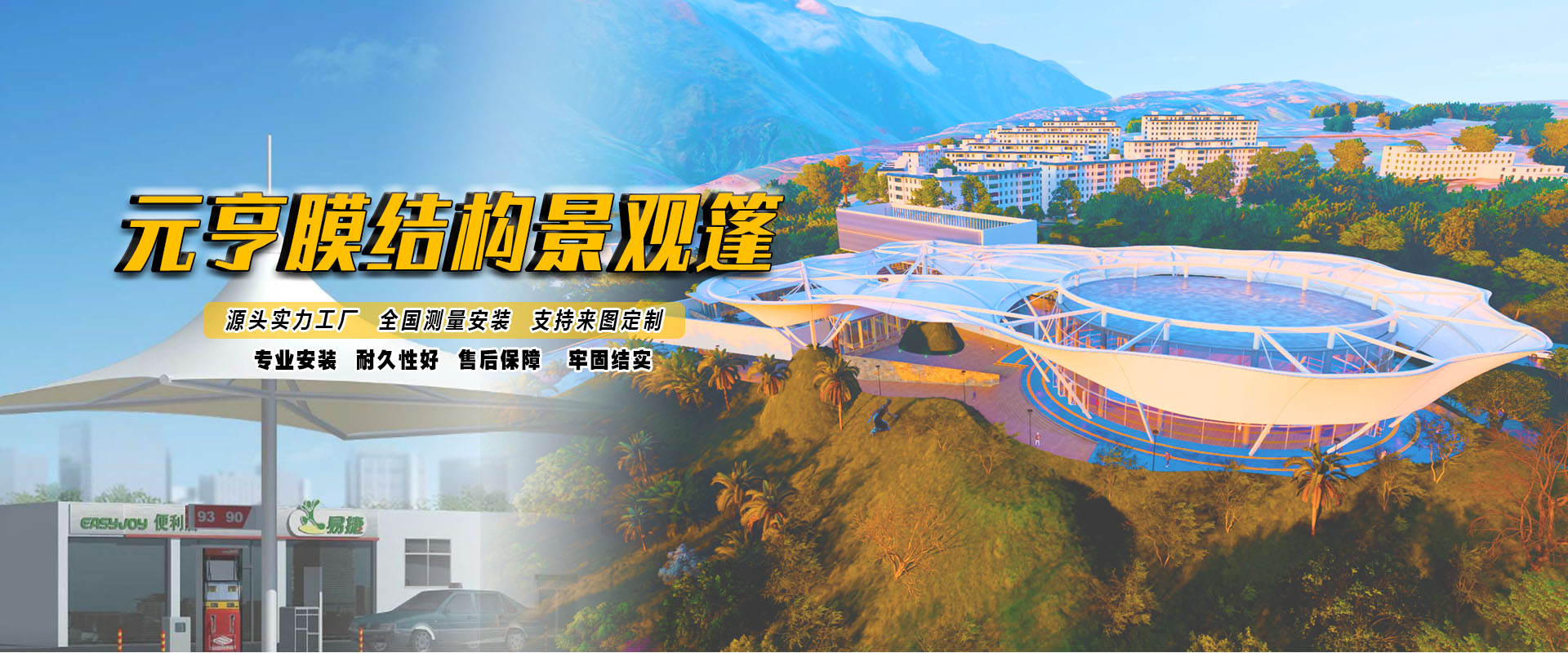 在充电桩停车棚膜结构的创新设计、张拉景观膜结构的艺术呈现、学校体育看台膜结构的活力四射,乃至大型体育馆与文化宫膜结构的宏伟壮观,我们均留下了深刻的印记。无论是交通设施的便捷构建,还是污水厂的环保改造,元亨膜结构总能以独到的视角、精湛的技术,为客户量身打造最适宜的解决方案,更是将科技与美学完美融合,为用户带来前所未有的便捷与舒适。